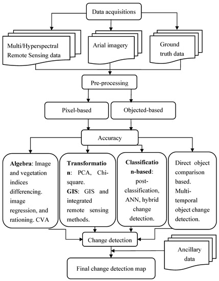 GIS integrates information from a variety of sources to detect changes. GIS can be used to detect changes in an area by providing a larger view and frequent coverage of the area [55]. Prakash and Kumar [59] present an algorithm for detecting changes in the environment caused by natural disasters using remote sensing and GIS. Since GIS combines the quantitative data with the source data, it is much easier to extract and evaluate change detection information. Rawat and Kumar [60] described a method for detecting land cover changes by utilizing remote sensing and geographic information systems. They indicated that with the GIS approach, change detection could be made easier, more accurate, and less expensive.