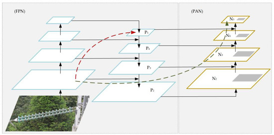 The FPN is a network consisting of bottom-up paths, top-down paths, and lateral connections, which enhances the communication of semantic and detailed information to improve the final detection accuracy. The PAN adds a bottom-up feature fusion layer based on FPN and uses adaptive feature pooling to aggregate features between different layers. Therefore, this paper constructed the neck part of ID-YOLO based on FPN and PAN, and its structure is shown in Figure 1.
