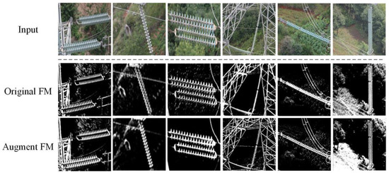 Input, Original FM, and Augment FM represent the original insulator image, the feature map of the ID-YOLO output, and the feature map of the Siamese ID-YOLO output, respectively. The features of the insulators in the feature map output by Siamese ID-YOLO are more pronounced, which is beneficial to improving the effectiveness of insulator detection.