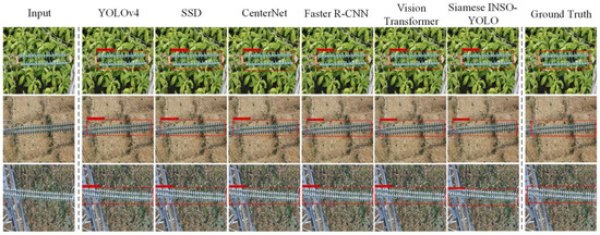 The results of different networks and improved methods are shown in Table 4. It can be seen from the results that the accuracy of the test results of Siamese ID-YOLO is not much different from that of Faster R-CNN, Vision Transformer, but it is significantly higher than that of single-stage SSD, YOLOv4. Nevertheless, CenterNet does not perform well on the insulator detection task, which we believe is caused by the complex background of insulator images and the low proportion of insulator images in the image. Compared with our base model ID-YOLO, the detection box of our model is more accurate, which indicates that edge extraction and the Siamese network play an important role. Experimental results show that Siamese ID-YOLO can effectively localize insulators in images.