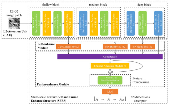 - A multi-scale feature self and fusion enhance structure (SFES) was proposed to fuse multi-scale features and enhance the feature representations. In the self-enhance module, a large-scale convolution assigns weights to shallow or deep features and refines a compact representation of a 1 × 1 map to achieve self enhancement, respectively. In the fusion-enhance module, a channel attention module identifies and assigns greater weights on invariant and significant features to enhance feature fusion, and a feature compression removes redundant features to increase the compactness of descriptors.