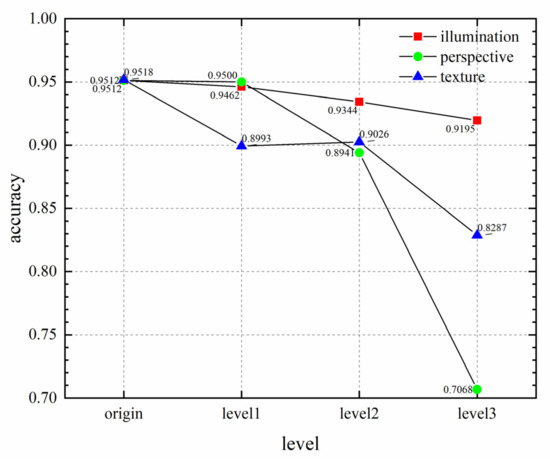 Since the application background of TRN for EDL, the robustness under more extreme imaging and matching conditions is another important aspect required testing, L2AMF-Net was tested on the robustness dataset to analyze its illumination, perspective, and texture robustness under more extreme imaging and matching conditions of the LCAM. The matching accuracy is shown in Figure 6.