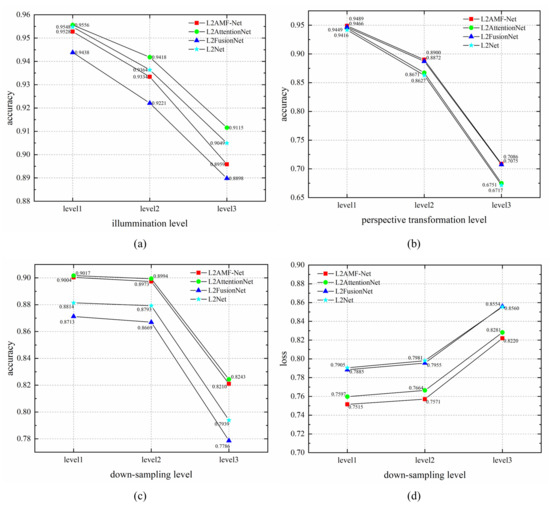 The robustness comparison of ablation study tested on robustness dataset. (a) Matching accuracy comparison of illumination robustness; (b) Matching accuracy of perspective robustness; (c) Matching accuracy comparison of texture robustness; (d) Test loss comparison of texture robustness. The results in (a,b) were respectively tested on illumination and perspective robustness datasets. The results in (c,d) were tested on texture robustness dataset. The values of the first column in (b) belong to L2AMF-Net, L2FusionNet, L2AttentionNet and L2-Net, respectively.