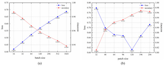 Results of batch size and patch size characteristic experiments. (a) Results of batch size characteristic experiment; (b) Results of patch size characteristic experiment. Both experimental results contained the test loss and test matching accuracy.
