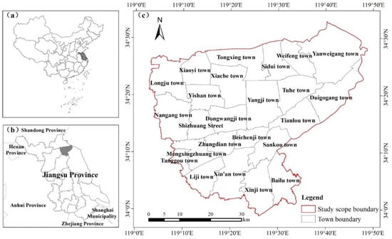 Location and extent of the research area. (a) Location of Jiangsu Province in China, (b) location of the study area in Jiangsu Province, and (c) specific location of the study area.