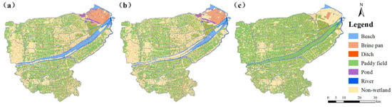 In 2009, 2014, and 2020, the total area of wetlands was 147,786.74 hm2, 139,418.82 hm2, and 177,295.93 hm2, respectively. Additionally, in 2009 and 2014, the wetland types with a relatively large area were paddy field, beach, and ditch, while in 2020, they were mainly paddy field, ditch, and river.