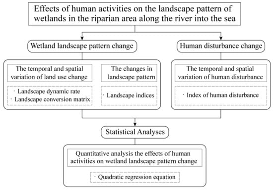 Xinyi River is one of the main runoffs flowing into the sea in Lianyungang City, Northern Jiangsu. It has a dense river network and widespread distribution of natural and artificial wetlands. However, under the influence of urbanization, industrialization, and agricultural modernization in Jiangsu Province, wetlands in this area have undergone significant changes. Understanding the linkages between wetland conversion to human activities is important. As Guannan County and Guanyun County are located on both banks of the Xinyi River, this study took these two counties as the study area. At the same time, the past decade has been an important period for the social and economic development of the two places, and relevant policies have also had positive or negative impacts on the region, so the period from 2009 to 2020 was selected as the research interval. In conclusion, the study of wetland changes and human interference in this region is of great significance for local wetland protection and ecologically sustainable development. The objectives of the present study are (1) to reveal the characteristics of the wetland landscape pattern changes in the riparian area along the river into the sea in the past 10 years; (2) to analyze the spatio-temporal heterogeneity of human disturbance in this region; and (3) to analyze the nonlinear relationship between human activities and wetland landscape pattern. Moreover, this study provides theoretical support for the protection and restoration of wetlands in the riparian area along the river in a coastal region, which is conducive to the ecological restoration and sustainable development of wetlands in relevant areas.