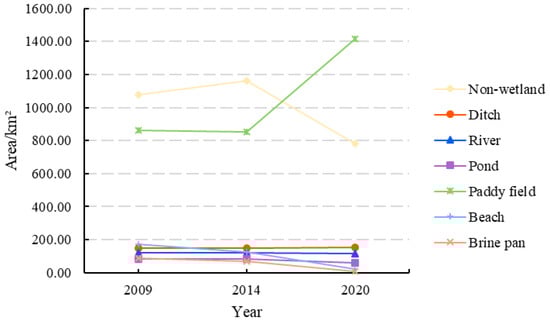 During the 2009–2020 period, the area of non-wetland increased from 2009 to 2014 and decreased from 2014 to 2020. In contrast, the area of paddy fields and ditch decreased from 2009 to 2014 and increased from 2014 to 2020. Other landscape types were reduced between 2009 and 2020. Overall, from 2009 to 2020, only the areas of paddy fields and ditch increased, with dynamic rates of 5.35% and 0.28%, respectively, and the area of the other landscape types including non-wetland, river, pond, beach, and brine pan decreased, with dynamic rates of −2.28%, −0.24%, −2.73%, −7.39%, and −7.42%, respectively.