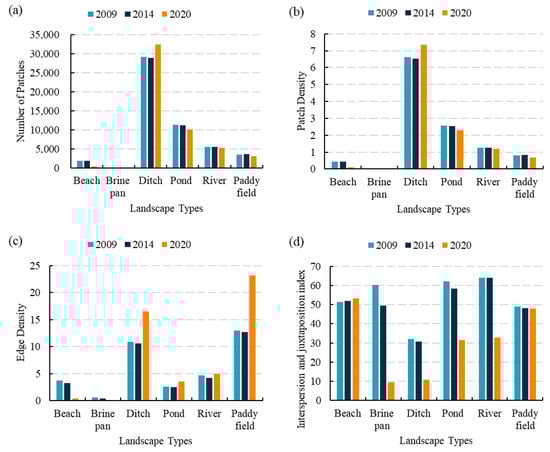 As shown in Figure 6c, the landscape types that had larger ED in the study area were paddy fields, ditch, rivers, and ponds. It is indicated that the edges of paddy fields, ditch, rivers, and ponds were more complex and affected by human activities. In addition, the ED of those four landscape types decreased from 2009 to 2014 and increased from 2014 to 2020, which indicated that the landscape shape of the four landscape types became a bit simpler in the 2009–2014 period and then become more complicated in the 2014–2020 period, whereas the ED of the beach and brine pan decreased from 2009 to 2020, the decline in ED meant that the total perimeter of the patches became smaller, and the patch shape developed regularly and was simplified.