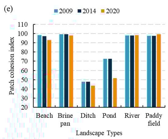The changes in IJI and COHESION for the study area are shown in Figure 6d,e. IJI is the interspersion and juxtaposition between one certain patch type and other patch types at the landscape class level. From 2009 to 2014, the IJI of all of the landscape types except the ditch was large, indicating that the distribution of these landscape types was more gathered and adjacent to other types. In the stage of 2014–2020, only the IJI of the beaches increased, while others showed a downward trend and their distributions were more discrete, with a few adjacent to other types. In short, the landscape of the study became more dispersive among different landscape types. COHESION is the cohesion of the same landscape type at the landscape class level. The COHESION of beach, brine pan, river, and paddy field was expressed much larger, indicating that the connectivity of these landscape types was at a high level. In contrast, the COHESION of the ditch and ponds was a bit small and showed a rapid decline from 2014 to 2020, which indicated that these landscape types were more scattered, and the connectivity between certain landscape types slowed down. In a word, except for a slight increase in the landscape connectivity in the river and paddy fields, the connectivity and aggregation decreased among the patches with the same landscape type from 2009 to 2020.
