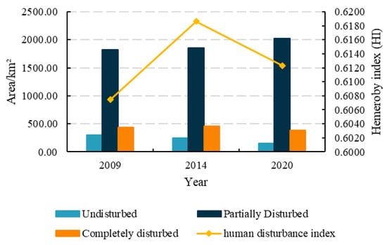 From 2009 to 2014, the human disturbance index showed a significant upward trend, and after 2014, the human disturbance index began to decline slowly. This indicates that the intensity of human disturbance in the whole study area increased in the 2009–2014 period and decreased in the 2014–2020 period. During the 2009–2020 period, the landscape types of different degrees of hemeroby changed significantly, which mainly showed that the area of undisturbed elements decreased year by year, while the area of partially disturbed elements increased gradually, and the area of completely disturbed elements showed a dynamic process of increasing–decreasing. Overall, the area of partially disturbing elements from 2009 to 2020 had an absolute advantage, and the change here was most intense.