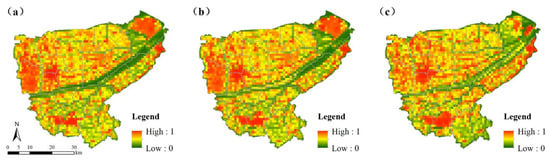 The spatial distribution of standardized human disturbance in the study area for three years: (a) 2009; (b) 2014; (c) 2020.