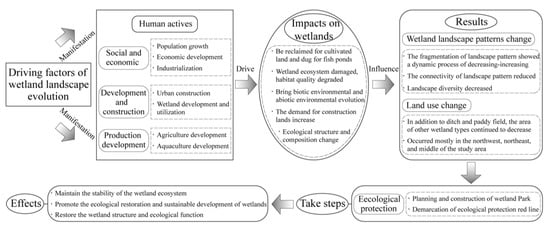 The results revealed that wetlands experienced drastic changes in the study area from 2009 to 2020. The area of the wetlands and the landscape fragmentation decreased during the 2009–2014 period and then increased during the 2014–2020 period. At the same time, the diversity and connectivity of the landscape decreased during the study period. For human activities, the human disturbance index showed a dynamic process of increasing–decreasing, and there were cores with high human interference in the northwest, southwest, and northeast of the study area. In addition, the human disturbance index changed greatly in the area along the river or around the cities and towns. Meanwhile, through the analysis of the quadratic regression equation, we found that there was an inverted U-shaped relationship between the human disturbance index and different landscape indices. The use of cultivated land and construction land as well as the distance to the city center, distance to the port, and distance to the industrial land affected the landscape change of the wetlands.. Attention should be paid to coordinating the development with ecological protection in the process of land use in this area, and ecological remediation should be carried out to improve the structure and ecological function of the wetlands near the city center, ports, and industrial land. The findings of the present study can provide important references for wetland protection as well as the restoration and maintenance of the sustainable development of wetland ecosystem services.