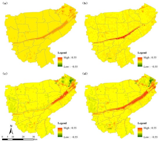The changes in human disturbance in the spatial dimension from 2009 to 2020. (a) The human disturbance stability from 2009 to 2020. (b) The changes in the period from 2009 to 2014. (c) The changes in the period from 2014 to 2020; (d) The changes in the period from 2009 to 2020.