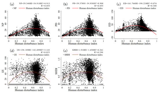 Relationship between the different landscape indices ((a) NP, (b) PD, (c) ED, (d) IJI, and (e) SHDI) and human disturbance index based on the landscape level.