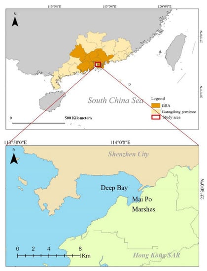 The Guangdong-Hong Kong-Macau Greater Bay Area (GBA), located in southern China, is the world’s largest megalopolis with a 70 million population (Figure 1). This megalopolis contains nine cities and two special administrative regions: Guangzhou, Shenzhen, Foshan, Zhuhai, Huizhou, Dongguan, Zhongshan, Zhaoqing, Jiangmen (cities of Guangdong Province), Hong Kong and Macao (Special Administrative Regions of China). Under the Chinese national development strategy, this megacity region has experienced rapid development during the last four decades. The large increase in spatial connection of human movements, traffic flow, and transport network greatly contributed to the degree of regional integration in the GBA [12]. The development of Shenzhen city (13 million) and Hong Kong Special Administrative Region (7.5 million) as two main core cities in GBA is a microcosm illustrating the interplay between urbanization and coastal wetlands in the tropics.