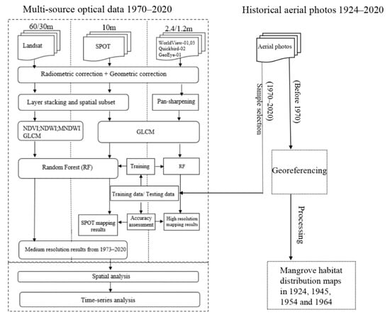 The methodology framework of this study. Multi-source optical data from 1970 to 2020 and historical aerial photos from 1924 to 2020 were separately processed for mapping. Spatial analysis and time-series analysis were conducted based on the mapping results.