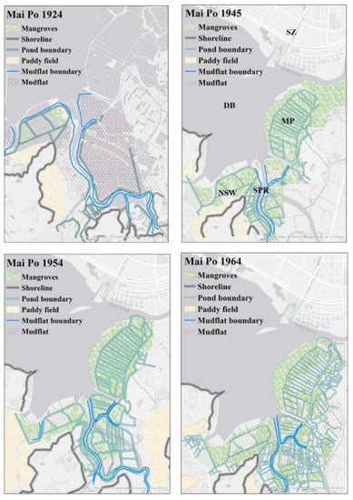 Figure 4 shows the land cover mapping results based on historical aerial photos from 1924 to 1964. In 1924, there were already some fishponds built near Nam Sang Wai and along the Shan Pui River. Large areas of mudflats were distributed around the Shan Pui River. Only a few mangroves were distributed inside the fishponds where data were available. By 1945, mangroves were largely distributed in the coastal area, including locations that used to be mudflats in 1924. The establishment of fishponds in mangrove habitats at Mai Po had already occurred by 1945. By 1954, the establishment of fishponds continued. Mangroves expanded and fully covered the gei wai area. By 1964, large areas of mangroves in the gei wai had changed into open mudflats, and mangrove losses can also be observed in other fishponds at Mai Po. In the tidal areas seaward to the fishponds, some expansion of mangroves can be observed on the mudflats in the seaward direction.