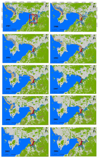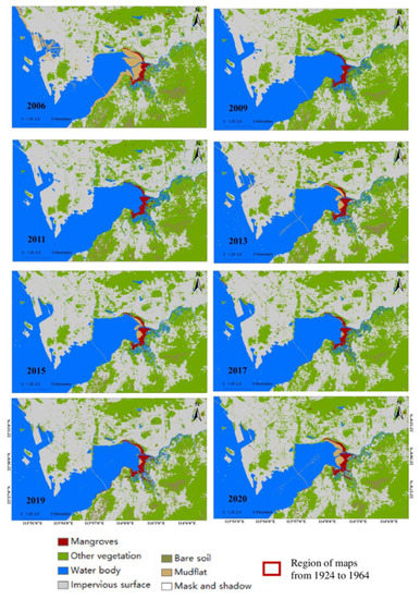 Land cover classification results from 1987 to 2020 are displayed in Figure 5. Mangrove habitats in Deep Bay kept expanding toward the sea both on the Hong Kong and Shenzhen sides during this period. In some parts of gei wai and Futian, mangrove habitats can be observed to have disappeared over time. By 1987, there was a large area of mangrove habitats on the west shore of Shekou (arrow), but this habitat gradually decreased, then was not present in 2004 due to the land reclamation project in Shenzhen. Other vegetation areas can be observed to gradually decrease and disperse in the study area from 1987 to 2020. The area of the water body also gradually decreased both for the coastal sea area and landward fishponds during the study period. Conversely, the impervious surface greatly expanded both along the coastal area toward the sea and in the inland area in the same period. The areas of mudflat changed sharply in some years due to the different tide levels when each image was captured.