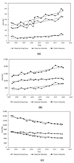 Areal changes of (a) mangrove habitats, (b) impervious surfaces, and (c) water and tidal mudflat in Deep Bay from 1987 to 2020.