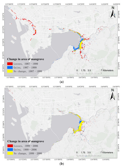 The performance of our analysis may be reflected by recent studies that used a similar approach. Previous studies such as Liu et al. (2018) [25] used time-series satellite imagery to determine the zonation and directional dynamics of mangroves in Mai Po in the past three decades. Liu et al. (2018) [25] found that mangrove coverage increased from around 150 ha to more than 350 ha from 1991 to 2015. The same study successfully identified the distribution change of four different mangrove species by using historical satellite imagery. A more recent study [24] estimated the mangrove area changes at GBA during 1990–2018 using remote sensing imagery. They also found two contrasting periods, in which mangrove areas decreased during 1990–2000 but increased rapidly during 2000–2018. The increase is mainly due to the restoration and protection effort and the introduction of exotic mangrove species, as well as changes in the hydrographic environment in inner Deep Bay.