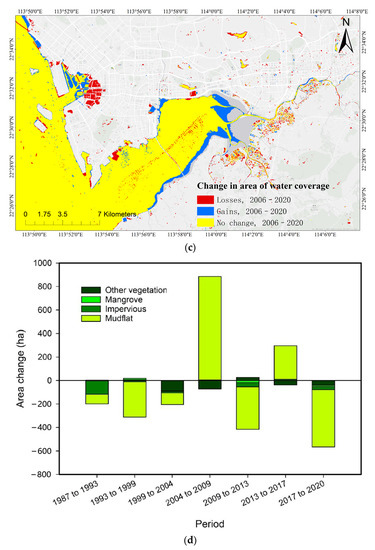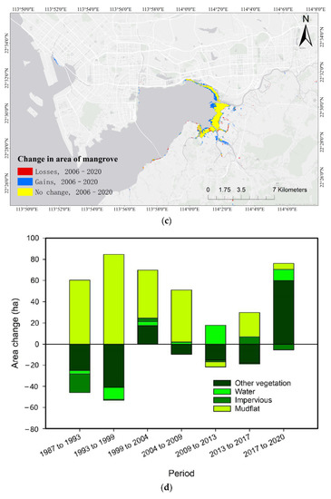 Mangrove habitats and other land cover types in Deep Bay between 1987 and 2020. (a–c), Change detection maps; and (d) Change detection statistics of mangrove habitats and other land cover types.