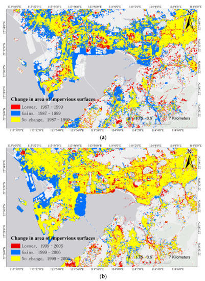 The temporal changes in the area of impervious surfaces in Deep Bay, on both the Hong Kong and Shenzhen sides, are displayed in Figure 6b. In the whole Deep Bay area, there is an overall increasing trend from around 13,000 ha to around 18,000 ha from 1987 to 2020, with a net increase of about 5000 ha (38.5%) and an increasing rate of 150 ha (1.15%) per year. On the Hong Kong side, the area of impervious surfaces increased from about 5000 ha to about 7000 ha (a 40% increase). Impervious surfaces in Hong Kong experienced a sharp increase especially from 2006 to 2015. For the Shenzhen side, the area of impervious surfaces increased from about 8000 ha to about 11,000 ha (37.5% increase). The period of a sharp increase in Shenzhen happened between 1987 and 1993.