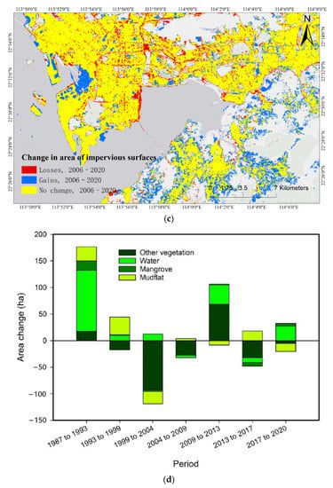 Impervious surfaces in Deep Bay from 1987 to 2020. (a–c) Change detection maps; and (d) Change detection statistics of impervious surfaces and other land cover types.