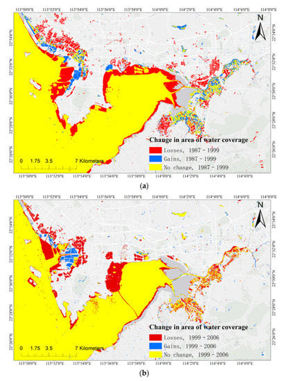 Water coverage in Deep Bay from 1987 to 2020. (a–c) Change detection maps; and (d) Change detection statistics of water coverage and other land cover types.
