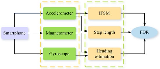 At present, smartphones use built-in MEMS sensors, such as accelerometers, gyroscopes, magnetometers, and gravimeters to produce measurements for PDR indoor positioning [,]. The process of PDR positioning is shown in Figure 1, in which the PDR positioning based on a smartphone is divided into three steps: gait detection, step estimation, and heading estimation. The use of PDR for positioning excels in terms of independent positioning, due to its relatively low cost and operation, without additional equipment and base station deployment.