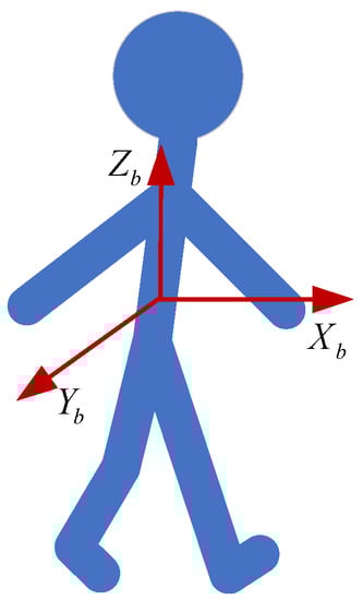 The acceleration, angular rate, and other information regarding pedestrians are collected with smartphones. In this study, the acceleration generated during walking is used to realize step-counting. Figure 2 shows the walking components of a pedestrian, with the origin at the pedestrian's center of gravity. The -axis, -axis, and -axis point to the forward, lateral and vertical, respectively.