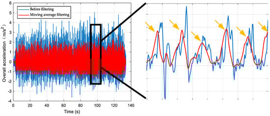 Considering that low-cost sensors are used in smartphones, the output signal of the inertial sensors bears substantial measurement noise. If the signal is directly used in gait detection, it will seriously undermine the accuracy of step counting. Therefore, a moving average filtering method with a window size of 7 is adopted to preprocess the resultant acceleration for the reduction of sensor noise, as shown in Figure 4. The right diagram is an enlarged part of the acceleration. As shown in Figure 4, the resultant acceleration signal, without filtering, shows a large number of burrs and more noise. Because some jitter errors are eliminated and their periodicity is highlighted, the acceleration waveform after moving-average filtering becomes smoother. According to the changing trend of filtered data, this conforms to the gait change of pedestrians with periodic alternation. Each footstep of the pedestrian will experience the process of lifting, leaving the ground, and falling back to the ground; the acceleration will increase and decrease periodically according to these motions.