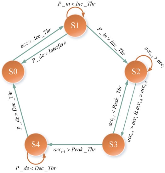 - The noise shielding mechanism is introduced in the rising state . If there is substantial noise in the data obtained by the accelerometer, the acceleration waveform will fluctuate violently, i.e., and will increase at the same time. Since is smaller than , it will first meet , and the system will return to the stable state for re-detection;