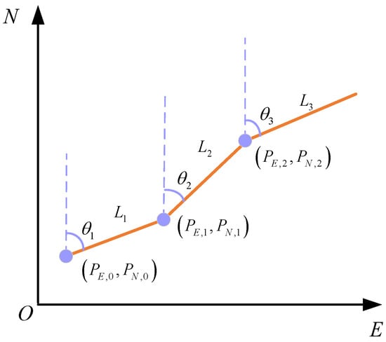 Assuming that the initial position of the pedestrian is , the position at the next time point is calculated using the step length and the heading , as shown in Figure 6.