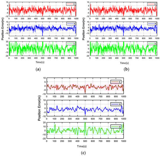 The GNSS positioning error. (a) Pseudo-range single-point positioning; (b) pseudo-range differential positioning; (c) carrier-smoothed pseudo-range differential location.