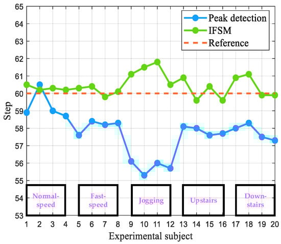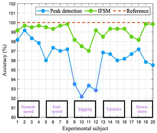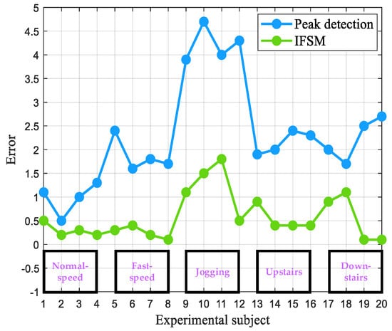 The peak detection and the IFSM algorithm are applied to step-counting, as shown in Figure 10. The error of step counting is plotted in Figure 11. The step-counting accuracy of all the algorithms is shown in Figure 12. The gait detection results of two algorithms under different motion states are depicted in Table 3.