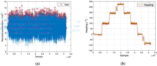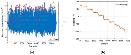 The PDR information in the fountain experiment environment. (a) The results of gait detection, based on the IFSM algorithm; (b) the estimations of the heading angle.