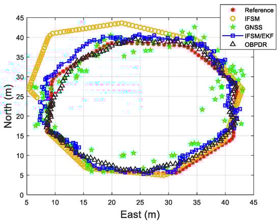 The positioning results of the fountain experiment are shown in Figure 14. The red line represents the real track (the positioning result of the GNSS receiver). The yellow line stands for the result of IFSM. The green line demonstrates the GNSS positioning result, based on Android. The blue line represents the result of IFSM/EKF, and the black line represents the results of the OBPDR method.