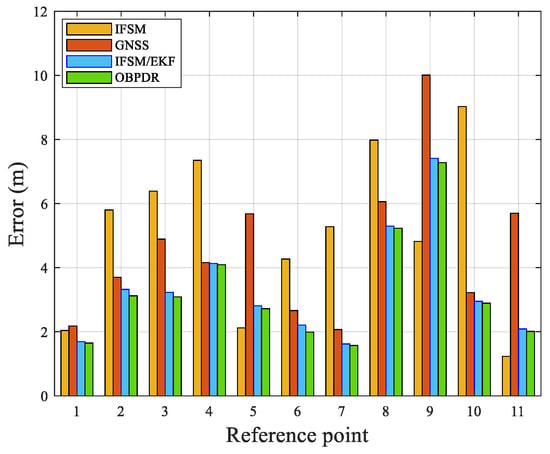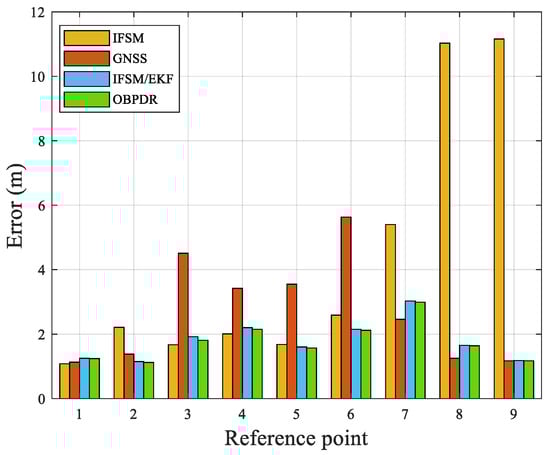 According to the reference points set in Figure 8a, the errors for each reference point in the fountain experiment are counted, as shown in Table 4. To analyze and compare more intuitively the positioning performance of IFSM, GNSS, IFSM/EKF, and the OBPDR method, a histogram of the error results of each reference point is shown in Figure 15.