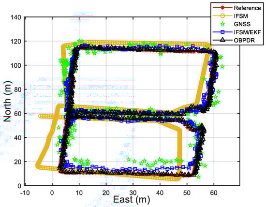 The performance of the OBPDR method is evaluated in this experiment. Our proposed methodology fuses the information from PDR, utilizing the IFSM algorithm and GNSS, and enhances the adaptability of the system to the environment, utilizing the AEKF algorithm. In order to verify the performance of the OBPDR method, we compare this method with the other three methods: (1) separate PDR based on IFSM, known merely as IFSM; (2) separate GNSS, known merely as GNSS; (3) the combination of IFSM and GNSS based on EKF, which is known as IFSM/EKF.