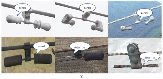 (a) Examples of normal and defective vibration dampers; (b) examples of normal and defective insulators.
