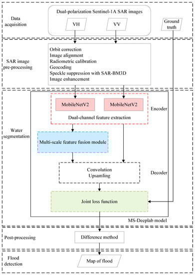 - An improved MS-Deeplab is proposed for flood detection in dual-polarization (VV and VH polarization) SAR images. The novel MS-Deeplab model can directly make full use of dual-polarization characteristics of water to realize the accurate detection of a flood.