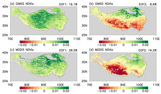 The first (EOF1; (a)) and second (EOF2; (b)) EOF modes of the JJAS standardized GIMMS NDVI anomalies over the TP during the period 2002–2014. (c,d) as in (a,b), respectively, but for the MODIS NDVI anomalies.