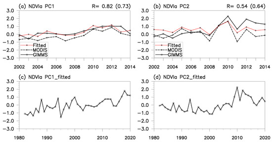 (a) The time series of PC1 during the period 2002–2014, in which the black solid, black dashed, and red dashed lines represent the GIMMS- and MODIS-based PC1, respectively. (b) as in (a), but for the time series of PC2. (c) The time series of the fitted and spliced PC1 during the period 1982–2020. (d) as in (c), but for the time series of PC2.