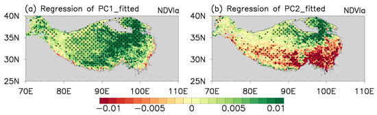 The NDVI anomalies regressed upon PC1 (PC2) during the period 1982–2020 show a uniform (dipole) pattern (Figure 4a,b), resembling the spatial distributions in Figure 2a,b. This signifies that the two primary patterns existed not only during the period 2002–2014 but also during the longer period 1982–2020. The above results reveal that the two primary patterns of NDVI over the TP stably existed in the period of 1982–2020, and the fitted and spliced PC indices can reflect the characteristics of the interannual variability of the TP NDVI.