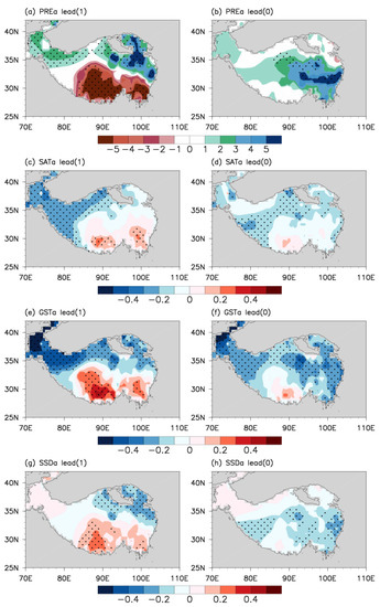 In Section 3.1, we found that variability of the JJAS NDVI shows two primary patterns over the TP, namely, the uniform and dipole NDVI patterns. Here, we further explore the local climatic factors responsible for the two primary patterns. Generally, the most important elements influencing vegetation growth are moisture and thermal conditions [69]. Thermal conditions for vegetation growth are mainly related to SAT, GST, and SSD, while moisture conditions are mainly associated with PRE. The NDVI does not always respond to the change in the thermal and moisture conditions immediately; instead, sometimes, the response of vegetation to local climatic factors (especially for PRE) has a certain lag [26,69,70,71,72,73]. Therefore, the simultaneous and time-lagged effects of the climatic factors on the two patterns were investigated.