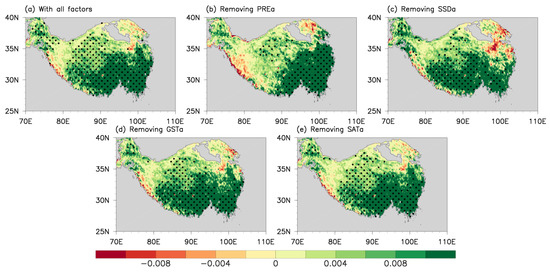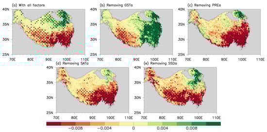 The NDVI anomalies regressed upon the combined-effect index for the DNI show that significantly positive (negative) anomalies appear over the northern (southern) TP, forming a dipole pattern (Figure 8a). This pattern is similar to the second mode of NDVI (Figure 4b), signifying that the PRE, SSD, SAT, and GST indices synergistically modulate the variability of the diploe pattern. After removing the influence of GST anomalies, the dipole pattern changed to an east–west pattern (Figure 8b). When the other climatic factor anomalies (PRE, SAT, and SSD anomalies) are absent, the dipole pattern is also unclear, and is especially insignificant over the northern TP (Figure 8c–e).