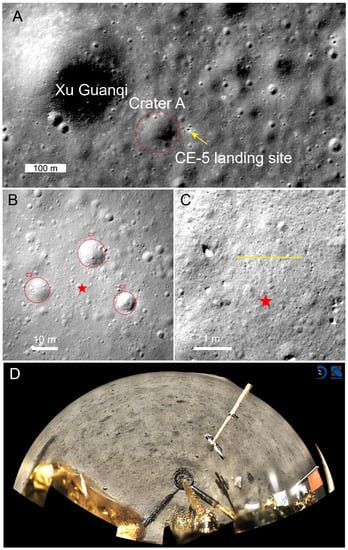 - Qian, Y.; Xiao, L.; Wang, Q.; Head, J.W.; Yang, R.; Kang, Y.; van der Bogert, C.H.; Hiesinger, H.; Lai, X.; Wang, G.; et al. China’s Chang’E-5 landing site: Geology, stratigraphy, and provenance of materials. Earth Planet. Sci. Lett. 2021, 561, 116855. [Google Scholar] [CrossRef]