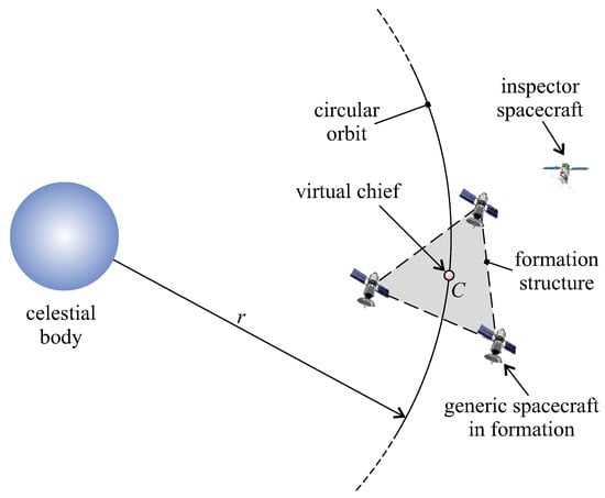 The work illustrated in this paper starts from the preliminary results by Caruso et al. [], who formulated an optimization method capable of determining the optimal relative (rendezvous) trajectory of a small satellite used to perform on-orbit inspections of each member of a spacecraft formation. The aim of this study is to refine and extend the procedure introduced in [] in order to determine the optimal trajectory (which minimizes the total velocity variation) of an IS that uses a set of impulsive maneuvers to obtain a flyby with each spacecraft of a given formation structure. To that end, a massless point that covers a circular orbit around a given celestial body was designed as the formation (virtual) chief, and the relative distance among the satellites in the formation was considered to be a constant of motion, in such a way that the formation maintains a rigid structure during the flight; see Figure 1.
