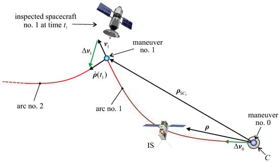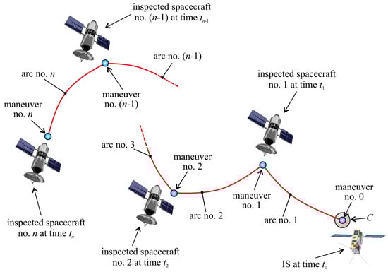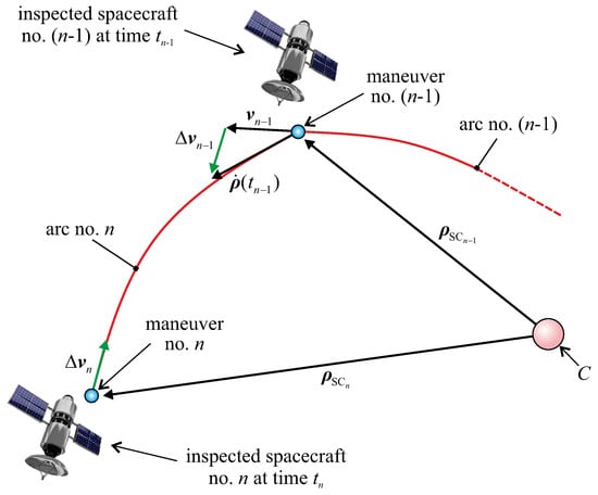 The whole inspection trajectory tracked by the IS can, therefore, be ideally partitioned into a sequence of n Keplerian arcs patched by impulsive maneuvers. The generic i-th arc starts at time , just after the -th impulsive maneuver that gives a velocity variation , and ends at time , just before the i-th impulsive maneuver that gives a velocity variation . The IS traces a multiple-impulse rest-to-rest (relative) trajectory; that is, the IS velocity relative to the formation structure is zero at both the beginning (when the IS position coincides with that of C) and the end (when the IS is close to the last inspected spacecraft) of the mission; see Figure 2.